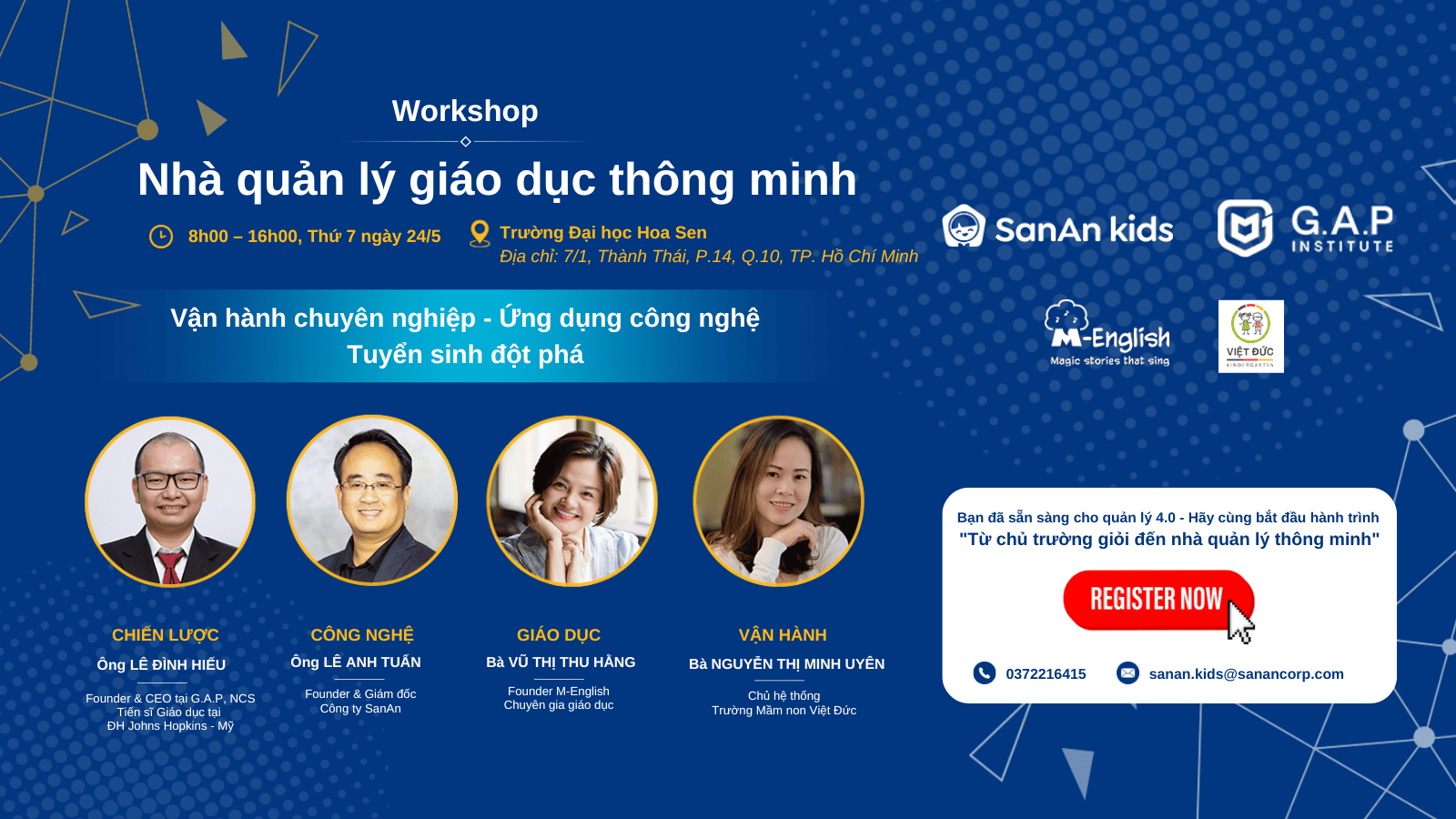 Sau sự kiện, bạn được đặt lịch tư vấn cá nhân hóa (online/offline) để rà soát và tối ưu vận hành & tuyển sinh cho chính ngôi trường của mình.